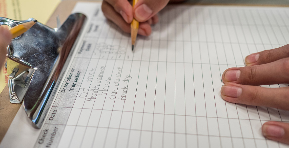 As part of the Reality Check simulation, students learn baseline money management skills such as using and managing a checking account. Participants are selected for roles and given explanations of their circumstances, such as marital status, number of children, income and monthly expenses.