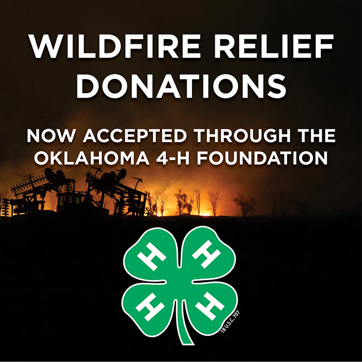 Donations can be made online at https://oklahoma4hfoundation.com/donate/. Click on the Donate button and designate Wildfire Relief in the Scholarship Fund box. Donations also may be mailed to the Oklahoma 4-H Foundation, 205 4-H Youth Development Building, Stillwater, OK 74078. Please make checks payable to the Oklahoma 4-H Foundation and note NW Fire Relief on the memo line.