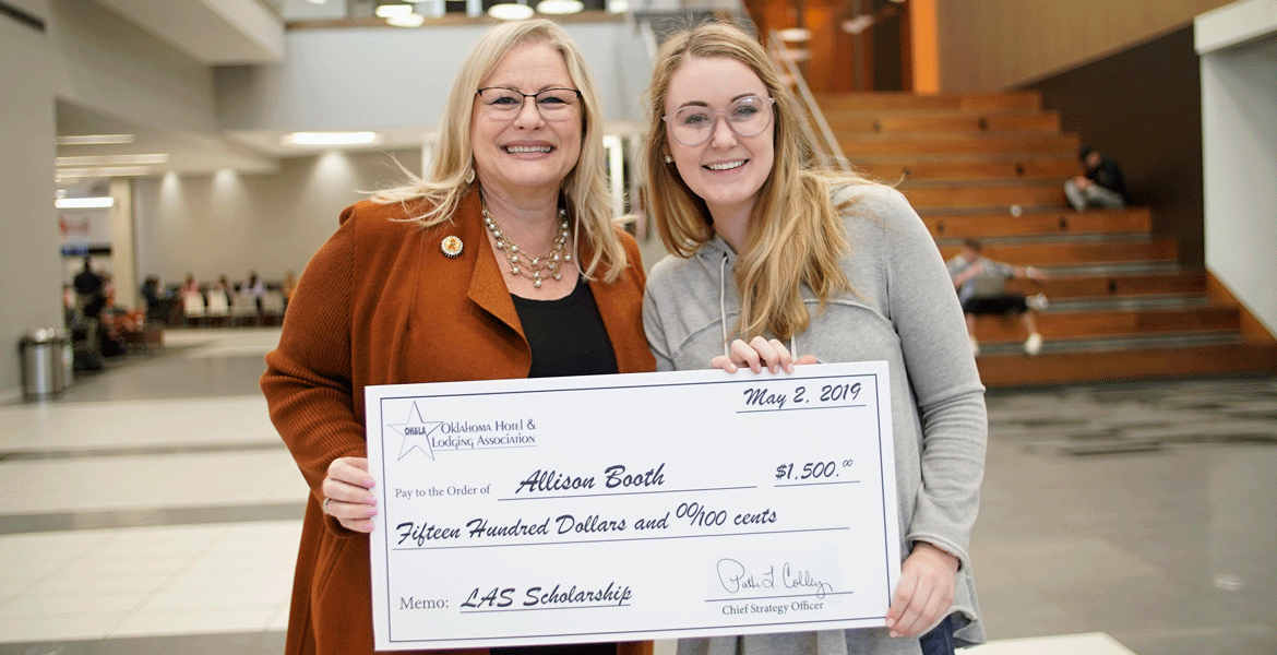 The LAS scholarship was presented to the Oklahoma State University junior by Patti Colley, chief strategy officer with the Oklahoma Hotel & Lodging Association. In addition to the $1,500 scholarship, Booth will be joining the Oklahoma delegation in Washington, D.C., on Sept. 10-11 for the American Hotel & Lodging Association Legislative Action Summit. She'll also have the opportunity while on Capitol Hill to visit with U.S. Senate and Congressional delegations about issues facing the lodging industry.