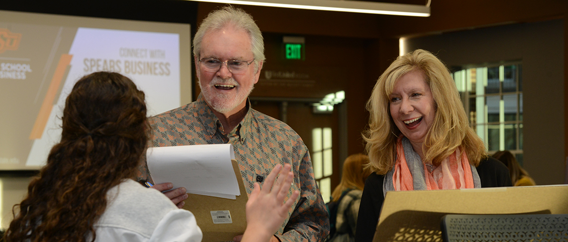 Oklahoma State University alumnus Roger Cagle and his wife Cindy Cagle sponsored a recent competition for OSU students to create a brand campaign for the couple’s Texas ranch. The Cagles were on hand at the Spears School of Business Dec. 6 to judge competition finalists and present a $1,000 first prize to the winning proposal and $500 to a Fan Favorite winner.
