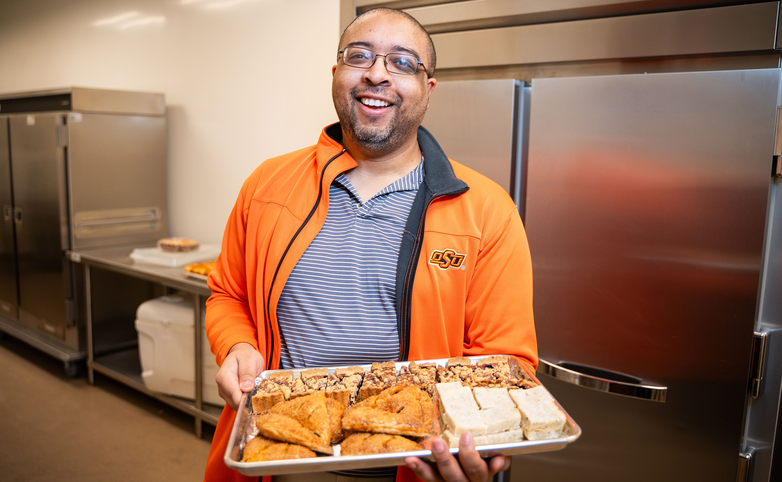 Perry, who holds a graduate certificate in entrepreneurship from Oklahoma State University, works as an academic advisor in the Spears School of Business. Between obtaining his undergraduate degree in communication from North Carolina State University and earning his master’s degree in journalism and media studies from the University of Nevada-Las Vegas, he added a different credential: a culinary arts certificate from Fayetteville Technical Community College in his home state of North Carolina.