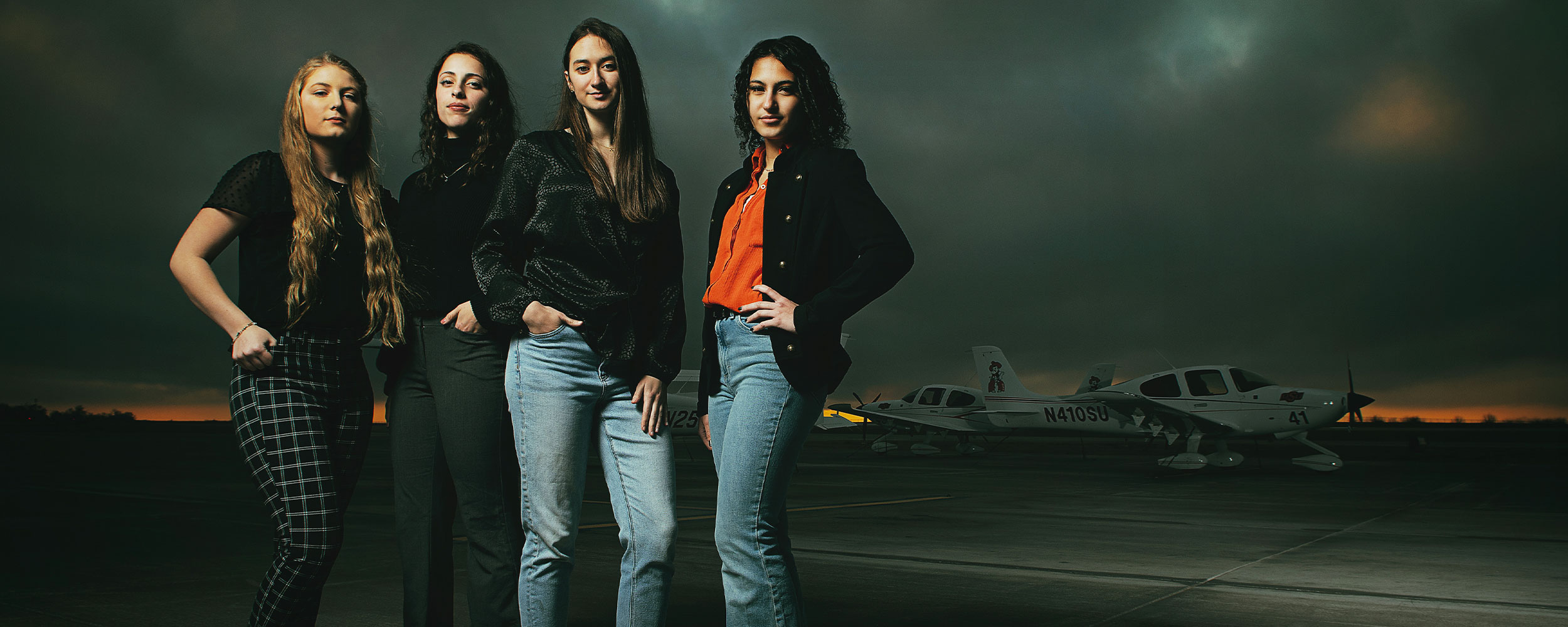 Females represent 16% of the entire undergraduate enrollment in OSU’s Aerospace Administration and Operations major, but students Anna Cook, Claire Reader, Dana Friend and Kristen Cunningham are shining in leadership positions.